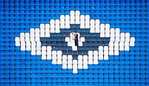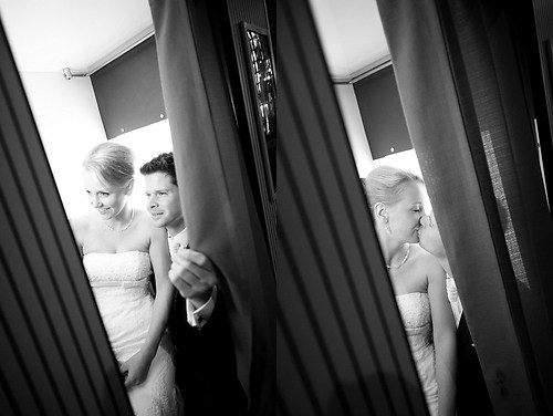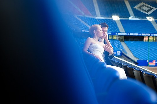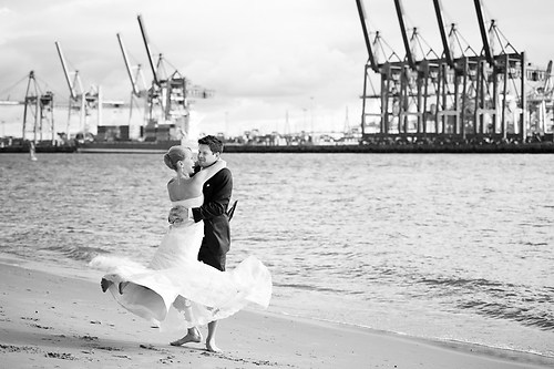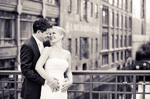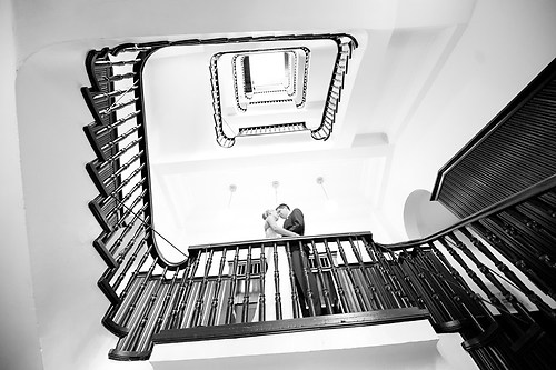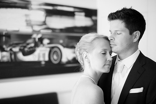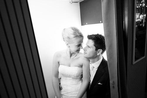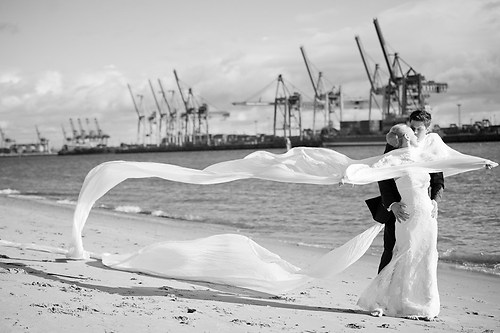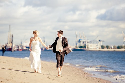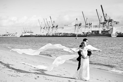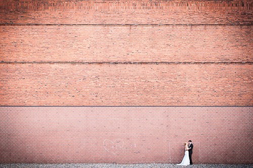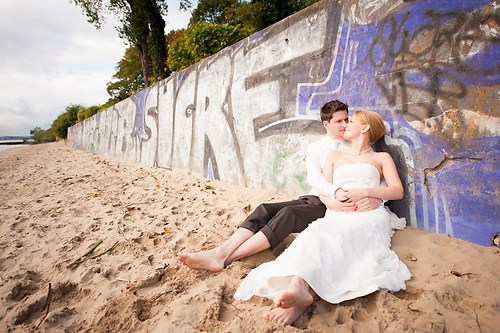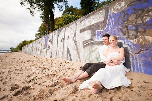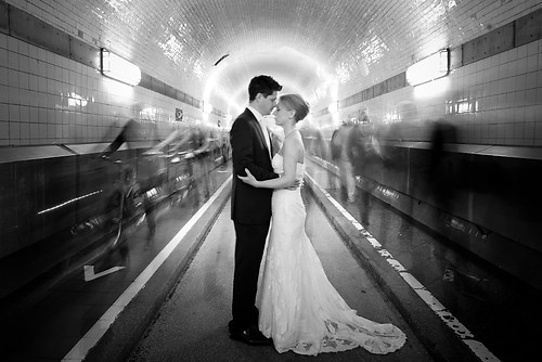 Maria und Sven haben in diesem Sommer ihre Hochzeit gefeiert. Weil sie sich bei einem Spiel des HSV kennengelernt haben, nutzten wir unter anderem das Stadion bei ihrem After-Wedding-Shooting, für das sie meinen Lehrmeister Dennis und mich gebucht hatten. Die ersten Hochzeitsfotos des Tages entstanden allerdings schon auf der wunderschönen Treppe unseres Hotels. Nachdem wir ungefähr eine Stunde Zeit hatten, um im Stadion zu fotografieren, fuhren wir zurück in die Stadt und setzten dort unser Hochzeitsshooting fort. Das Wetter zeigte sich nordisch durchwachsen. Am Elbstrand aber hellte der Himmel kurz auf und wir nutzten unsere Chance. Im weiteren Verlauf besuchten wir die Speicherstadt in Hamburg, wo unter anderem das Bild mit der riesigen Hausfassade entstand. Am Abend machten wir uns erneut auf, um mit entfesselten Blitzen zu arbeiten. Die letzten Bilder entstanden in einem Fotoautomaten im Herzen Hamburgs.